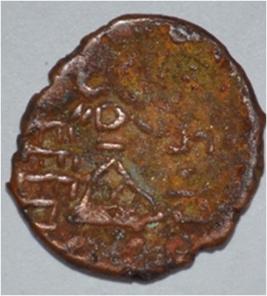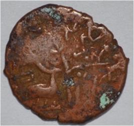 Coin in irregular shape. Obverse Deer at the right bottom and facing female figure with upraised right hand. Brahmi legend in semi-circle. Reverse Tree in railing showing three horizontal branches, arched hill with umbrella at the centre, triangle headed on the right swastika above and nandi pada on the top.