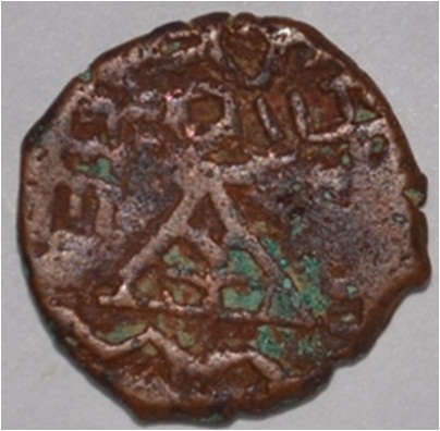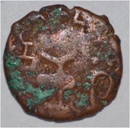 Coin in irregular shape. Obverse Deer at the right bottom and facing female figure. Brahmi legend on the top. Reverse Tree in railing on the right, six arched hill with umbrella at the centre, wavy line below, swastika on the left and nandi pada on the top.