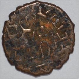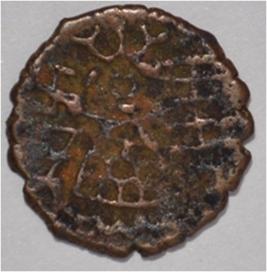 Coin in irregular shape. Obverse Deer on the right and facing female figure with upraised right hand. Brahmi legend in semi-circle. Reverse Triangle headed on the right, swastika above, ten arched hill with umbrella at the centre, tree in railing in left and nandi pada on the top.