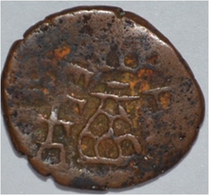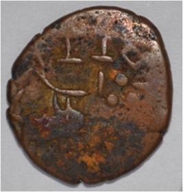 Coin in irregular shape. Obverse Deer at the bottom and facing female figure. Brahmi legend on the top. Reverse Tree in railing in right, six arched hill with umbrella at the centre, triangle headed in left and nandi pada on the top.