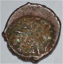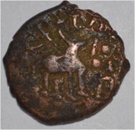 Coin in irregular shape. Obverse Deer at the centre and facing female figure with upraised right hand. Brahmi legend in semi-circle. Reverse Tree in railing in right, arched hill with umbrella at the centre, triangle headed on the left, swastika above and nandi pada on the top.