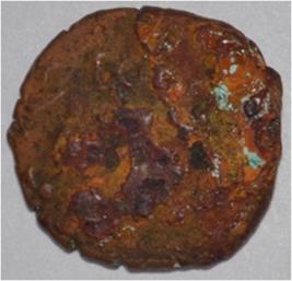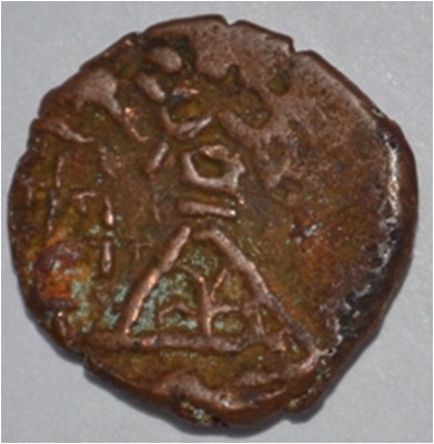 Coin in irregular shape. Obverse Coin eroded and rusted. Reverse Tree in railing in right, six arched hill with umbrella at the centre and nandi pada on the top left.