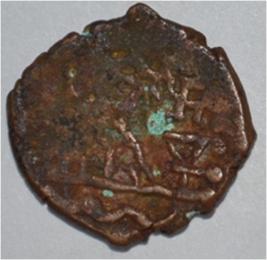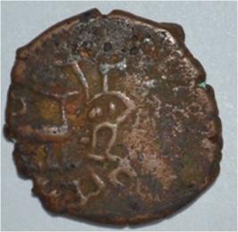 Coin in irregular shape. Obverse Deer on the right and facing female figure with upraised right hand, left hand on the hip. Brahmi legend below. Reverse Arched hill with umbrella on the right, triangle headed standard with a base in left and swastika above.