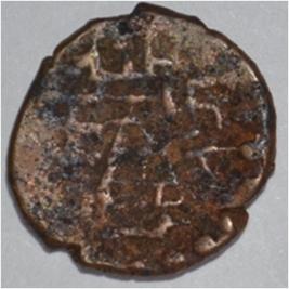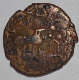 Coin in irregular shape. Obverse Deer at the centre and facing female figure. Brahmi legend in semi-circle. Reverse Tree in railing in right, arched hill with umbrella at the centre,triangle headed on the left and swastika above and nandi pada on the top.