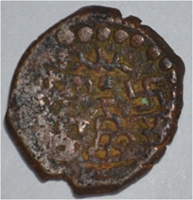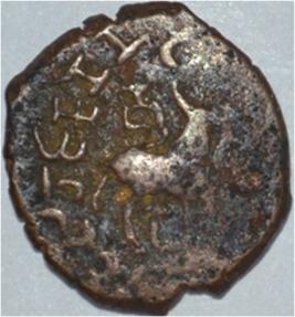 Coin in irregular shape. Obverse Deer at the centre and facing left. Brahmi legend in semi-circle. Standard above the deer. Reverse Tree in railing in right, arched hill with umbrella at the centre,triangle headed on the left and swastika above and nandi pada on the top.