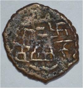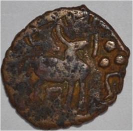 Coin in irregular shape. Obverse Deer at the centre and facing female figure with upraised right hand. Brahmi legend on the top. Reverse Tree in railing in right, six arched hill with umbrella at the centre, triangle headed on the left and swastika above and nandi pada on the top.
