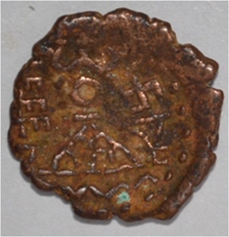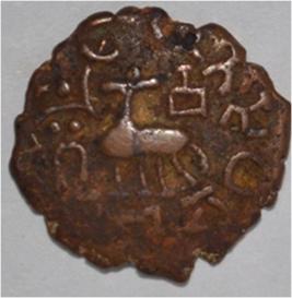 Coin in irregular shape. Obverse Deer at the centre and facing female figure with upraised left hand, right hand on the hip. Traces of legend in semi-circle. Reverse Tree in railing in right, seven arched hill with umbrella at the centre, triangle handed standard with base on the left swastika above and nandi pada on the top. Dotted border in left and wavy line below arched hill.