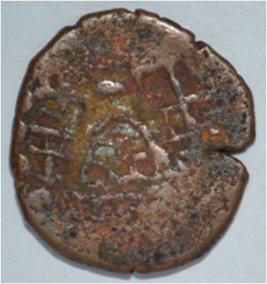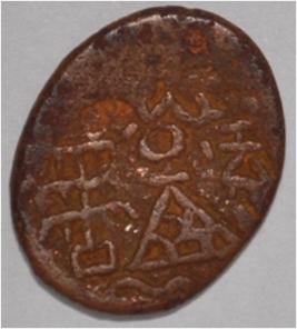 Coin in irregular shape. Obverse Deer at the centre and facing female figure with upraised right hand. Brahmi legend on the top. Reverse Tree in railing in right , six arched hill with umbrella at the centre, triangle headed on the left and nandi pada on the top.