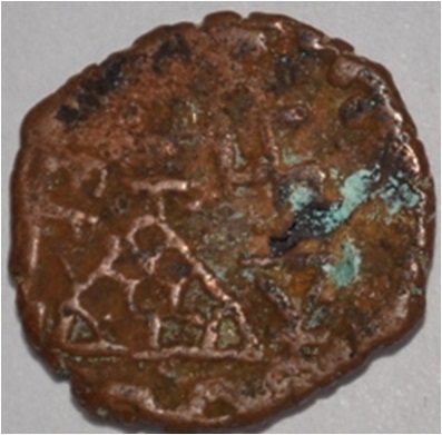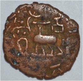 Coin in irregular shape. Obverse Deer at the centre and facing female figure with upraised left hand and right hand on hip. Traces of legend at the bottom. Reverse Tree in railing in right, ten arched hill with umbrella at the centre, triangle headed on the left and swastika above.