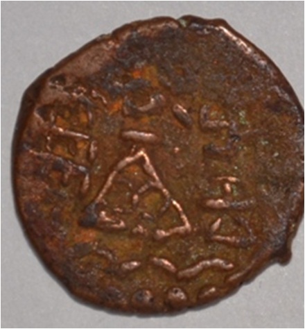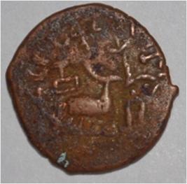 Coin in irregular shape. Obverse Deer at the centre and facing female figure with upraised right hand, left hand on the hip. Brahmi legend in semi-circle. Reverse Tree in railing in right, six arched hill with umbrella at the centre, triangle headed on the left and swastika above.