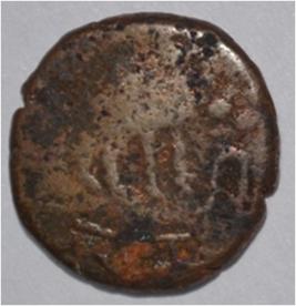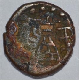 Coin in irregular shape. Obverse Deer at the centre and facing female figure. Traces of legend at the bottom. Reverse Six arched hill with umbrella at the centre, tree in railing in left and nandi pada on the top.