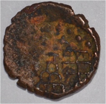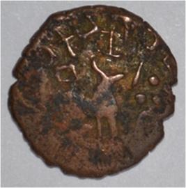 Coin in irregular shape. Obverse Deer at the centre and facing female figure with upraised right hand. Brahmi legend on the top. Reverse Six arched hill with umbrella at the centre and tree in railing with horizontal branches, each with short vertical leaves pointing down wards in left.