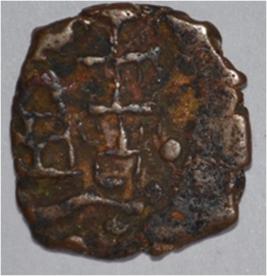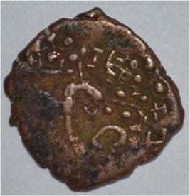 Coin in irregular shape. Obverse Deer on the right and facing female figure with upraised right hand, left hand on hip. Traces of legend in semi-circle. Reverse Arched hill with umbrella on the right and tree in railing with three horizontal branches, each with short vertical leaves in left.