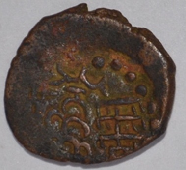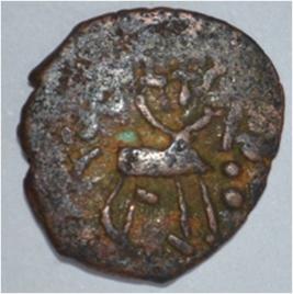 Coin in irregular shape. Obverse Deer at the bottom and facing female figure. Traches of legend on the top. Reverse Arched hill with umbrella at the centre, tree in railing in left and nandi pada on the top.