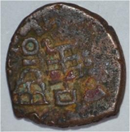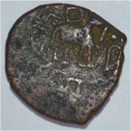 Coin in irregular shape. Obverse Deer on the top and facing female figure with upraised right hand. Traces of legend in semi-circle. Reverse Five arched hill with umbrella on the right, nandi pada above and tree in railing at the centre.