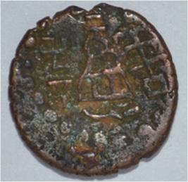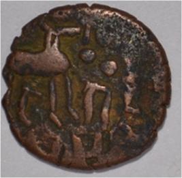Coin in irregular shape. Obverse Deer on the top right and facing female figure with upraised right hand.Traces of legend at the bottom. Reverse Triangle headed on the right and swastika above, six arched hill with umbrella at the centre and tree in railing in left.