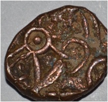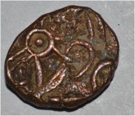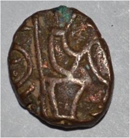 Coin in irregular shape. Obverse Horseman on the top holding penon. Reverse Couchant bull facing right and traces of legend on the top.