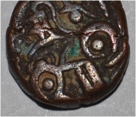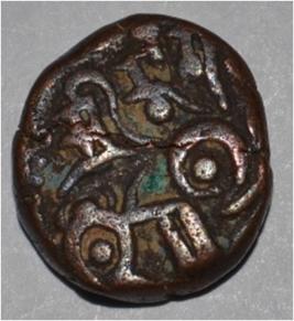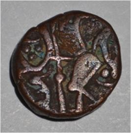 Obverse Horseman on the top holding penon. Reverse Couchant bull facing right and traces of legend on the top. Dotted border on the right side.