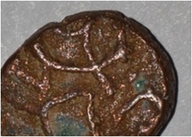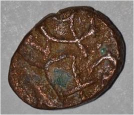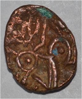 Coin in irregular shape. Obverse Horseman on the top holding penon. Reverse Couchant bull facing right and traces of legend on the top.