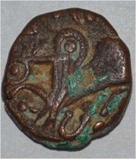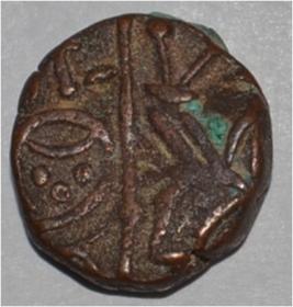 Obverse Horseman to the left. Man on the horseback and flagpole at the back of horse. Reverse Couchant bull facing right and traces of legend on the top.