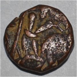 Obverse Horseman to the left. Man on the horseback and flagpole at the back of horse. Reverse Couchant bull facing right and traces of legend on the top.