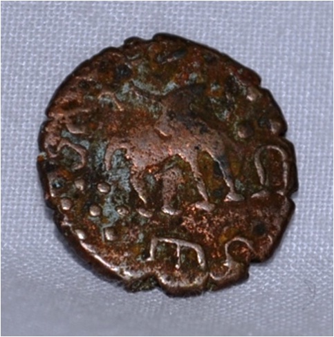 Irregular shape . Obverse Deer to left and facing female figure, and right hand up raised and dotted circle below the tail of deer and Brahmi leagend. Reverse Six arched hill with umbrella on the top on left swastika symbol and trangle headed with base and at the right tree-in railing and nandipada symbol at the top of the hill.