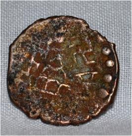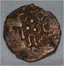 Obverse At the left side deer and a female figure at the centre, up raised right hand and brahmi legend on the the top. Reverse Tree-in railing on the right, six arched hill at the centre, triangle headed with base on left side and swastika symbol on the top.