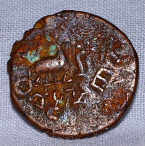 Obverse Deer to left and facing female figure and a circle below the tail and Brahmi leagend on left side. Reverse On the right tree in railing, six arched hill with umbrella at the centre,triangle headed standard with a base on the left. Nandi pada on the top and swastika symbol below it.