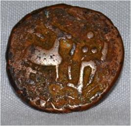 Obverse Deer to left and facing female figure. Reverse On the centre six arched hill with umbrella at the top, tree in railing on the left, swaslika and nandi pada on the top.