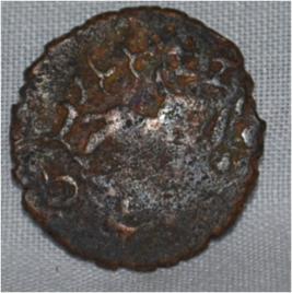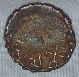 Obverse Deer at the centre and brahmi legend around it. Reverse On the left triangle headed with a base , six arched hill with umbrella at the top and tree in railing.