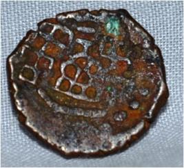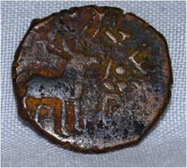 Obverse Deer on the left and facing the female figure at the bottom and brahmi legend on the top. Reverse In right tree in railing, seven arched hill with umbrella at the centre and swastika symbol on the top.