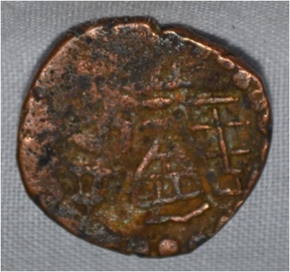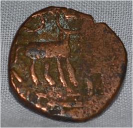 Obverse Deer on the left and brahmi legend on top and bottom. Reverse In right triangle headed with a base, six arched hill with umbrella at the centre, tree in railing on the left and triratna symbol on the top.