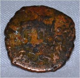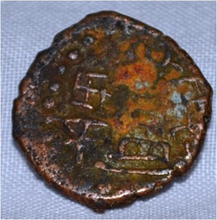 Obverse Deer on the left on the top and facing female figure, with up raised right hand. Reverse Triangle headed with a base in right, six arched hill at the centre, tree in railing in left and swastika above triangle headed and nandi pada on the top.