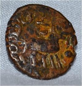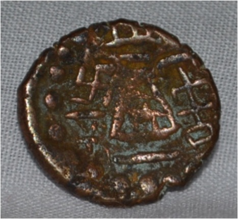 Obverse Deer at the centre and brahmi legend around. Reverse Triangle headed with a base in right and swastika above it, six arched hill with umbrella at the centre, tree in railing in left and nandi pada on the top.