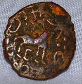Obverse Deer and female figure on the centre and brahmi legend in half around. Reverse Triangle headed with a base in right, six arched hill with umbrella at the centre, tree in railing in left, swastika and triratna symbol at the top.