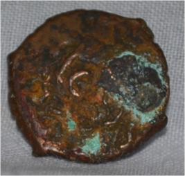 Obverse Deer on the top and brahmi legend at the bottom. Reverse Triangle headed with a base in lower right and swastika above it, six arched hill with umbrella at the centre, tree in railing on the left, nandi pada on the top.