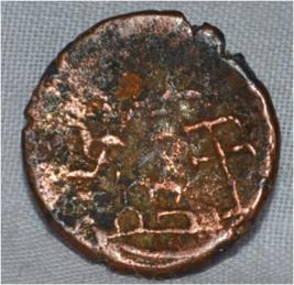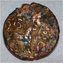 Obverse Deer and female figure at the bottom and brahmi legend on the top. Reverse Triangle headed with a base in lower right and swastika above, six arched hill at the centre, tree in railing on the left.