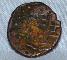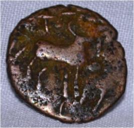 Obverse Deer on the left and facing female figure and brahmi legend on the top. Reverse Tree in railing on the right, arched hill at the centre, triangle headed on the lower left and swastika above it.
