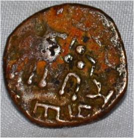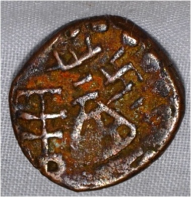 Obverse Deer at the left and facing female figure with up raised right hand and brahmi legend on the top and bottom. Reverse Tree in railing on the right, six arched hill with umbrella at the centre, swastika on the left and nandi pada on the top.