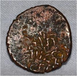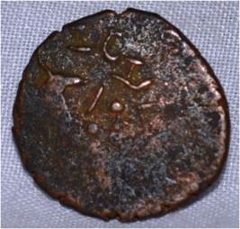 Obverse Deer on the left and facing female figure with up raised right hand, on the top and brahmi legend at the bottom. Reverse Triangle headed with a base in right and swastika above it, six arched hill with umbrella at the centre, tree in railing on the left, nandi pada on the top.