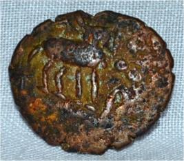 Obverse Deer at the left and facing female figure with up raised right hand, on the top. Reverse Swastika symbol on the right, triangle headed with a base at the centre, tree in railing in left, triratna symbol on the top.