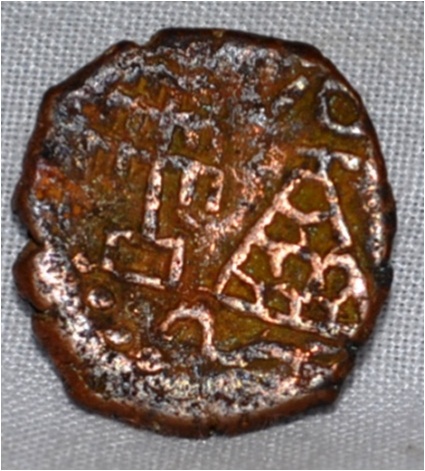 Obverse Deer on the left and facing female figure on the bottom and brahmi legend on the top. Reverse Tree in railing in right and ten arched hill with umbrella at the centre. Snake waving line at the bottom.