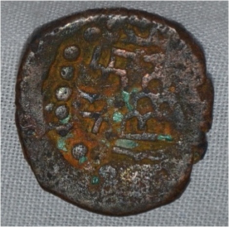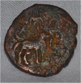Obverse Deer on the left and facing female figure at the bottom and brahmi legend on the top. Reverse Triangle headed with a base in right and swastika above it, six arched hill with umbrella on the left, nandi pada on the top.