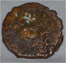 Coin in irregular shape. Obverse Coin is not clear and brahmi legend on it. Reverse Six arched hill at the centre, tree in railing on the left and triangle headed with a base in right.