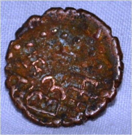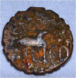 Coin in irregular shape. Obverse Deer on the left and facing female figure at the centre and brahmi legend on the top. Reverse Six arched hill on the lower right, tree in railing in lower left and swastika symbol on the top right.