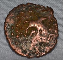 Obverse Deer facing female figure and brahmi legend on the top. Reverse Triangle headed with a base in right, six arched hill with umbrella at the centre, tree in railing in left, swastika and nandi pada on the top.