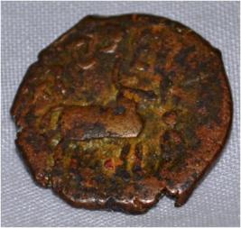 Irregular shape. Obverse Deer on the left facing female figure and brahmi legend on the top. Reverse Swastika on the right, five arched hill with umbrella at the centre, tree in railing in left and nandi pada on the top.
