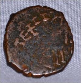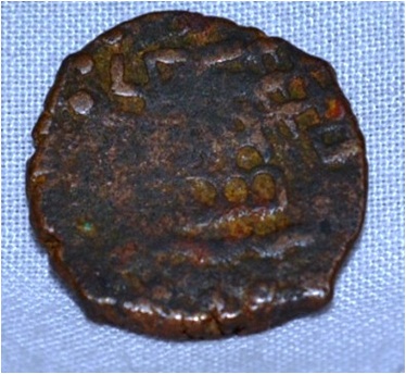 Irregular shape. Obverse Deer at the left lower side and brahmi legend on the top. Reverse Six arched hill at the centre, tree in railing in left and swastika symbol on the top right side.