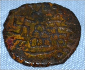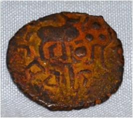 Irregular shape. Obverse Deer on the left facing female figure on the top and brahmi legend at the bottom. Reverse Triangle headed on lower right and swastika above it, six arched hill at the centre and tree in railing in left.
