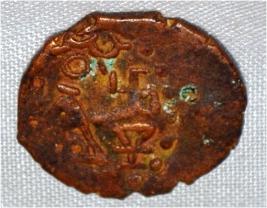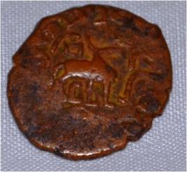 Obverse Deer on the left facing female figure and brahmi legend in semi-circle. Reverse Arched hill on the right and triangle headed with base at the centre and swastika above it. Nandi pada on the top.